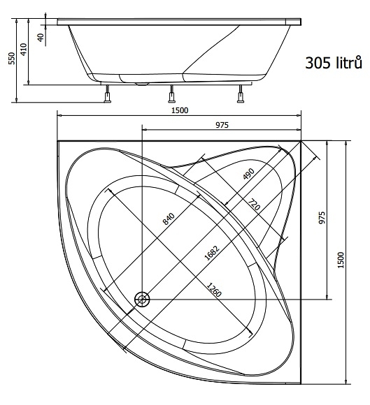 Popis Aqualine oválna rohová vaňa DYJE 150 cmAqualine rozmery: 150 x 150 x 42 cm, objem: 305 l
