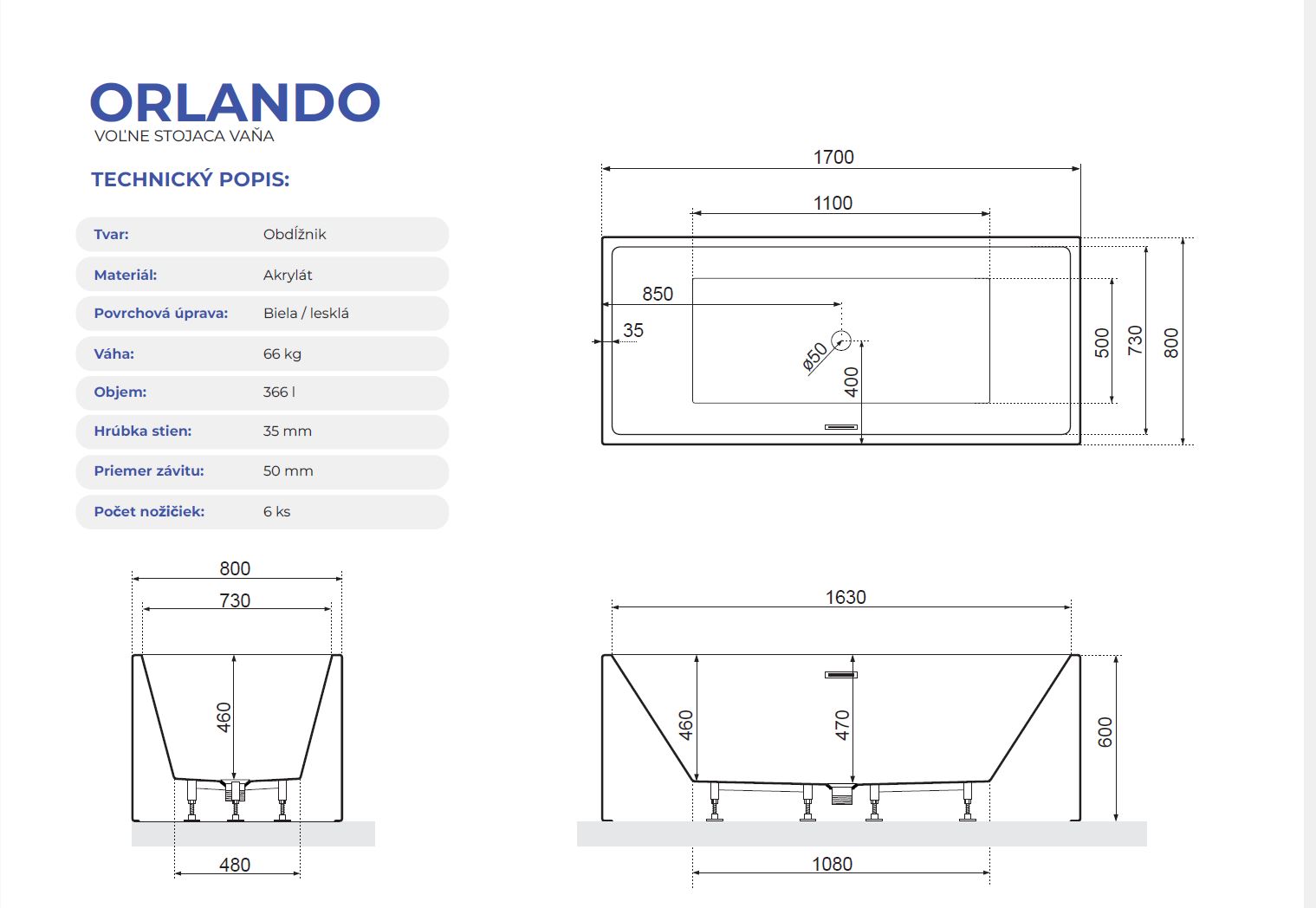 Aquatek ORLANDO samostatne stojaca vaňa akrylátová 170 cmRozmery: 170 x 80 x 60 cm, Objem: 366 l