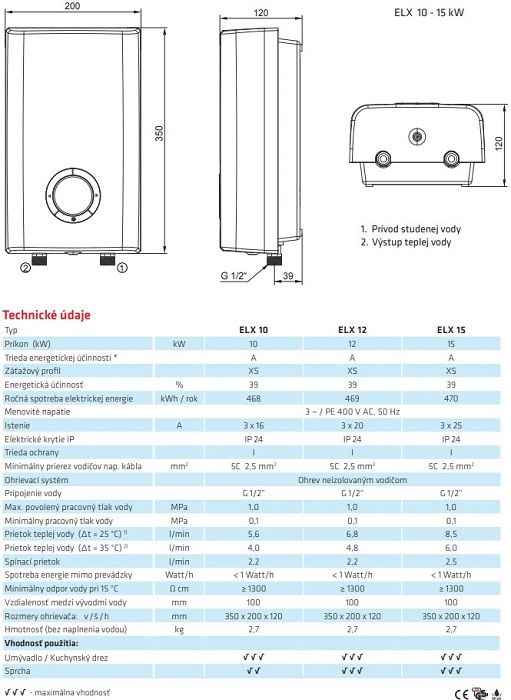 Popis Eliz ELX 10/12 kW COMPACT prietokový ohrievač vodyEliz bez batérie