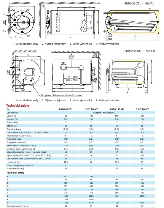 Eliz EURO 200 XTL ohrievač kombinovaný ležatýtepelný výkon výmenníka: 23 kW, plocha výmenníka: 0,77 m2, el.špirála: 2kW