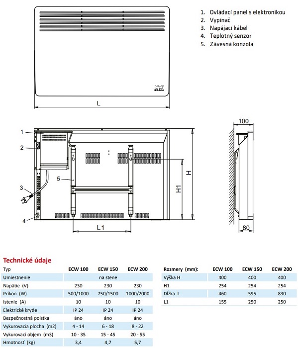 Priamovykurovací elektrický konvektor Eliz ECW s výkonom 500 / 1000 W, 750/ 1500 W, 1000/ 2000 W