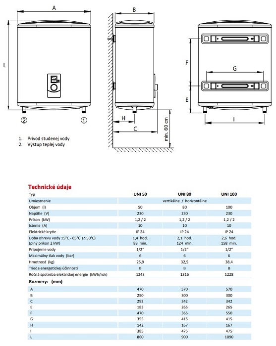 Popis Eliz UNI 100 ohrievač vody plochý 100 lEliz Rozmery: 570 x 1090 x 300 mm, Objem: 100 l, Príkon: 1,2 / 2 kW