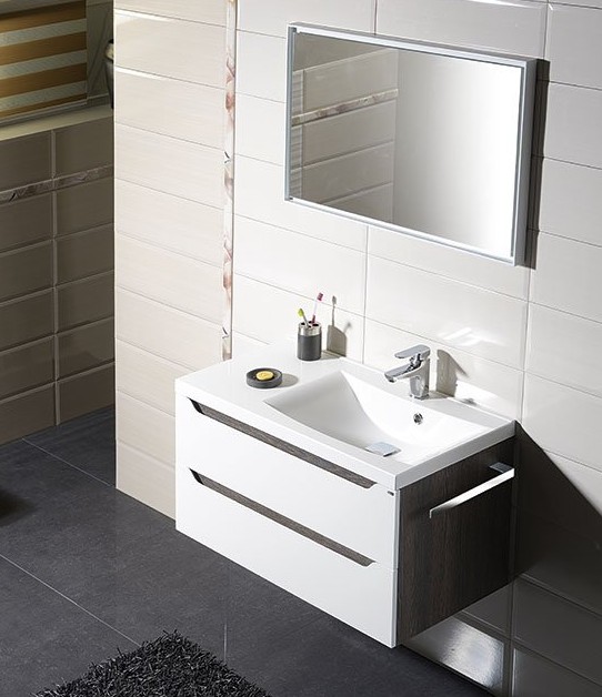 Popis Erra WAVE II skrinka pod umývadlo 90 cm ľavá biela/dub striebornýSapho Rozmery: 79,7 x 45 x 47,8 cm, závesná na stenu, 2 zásuvky,