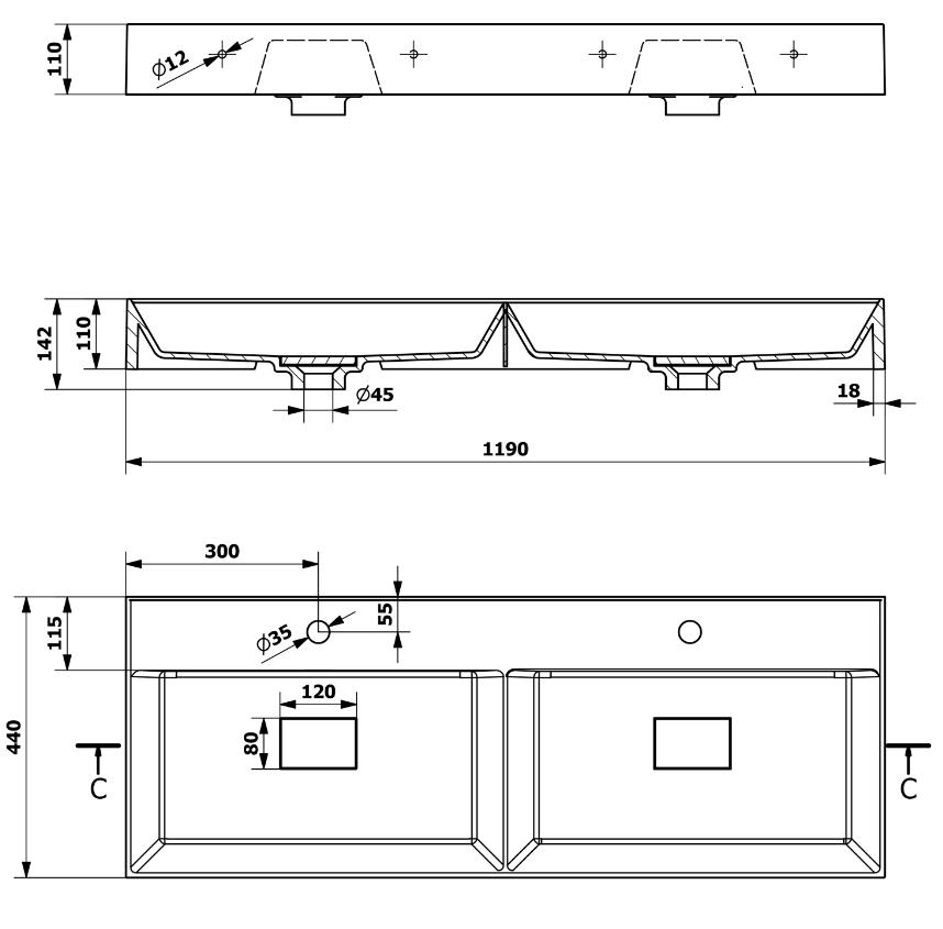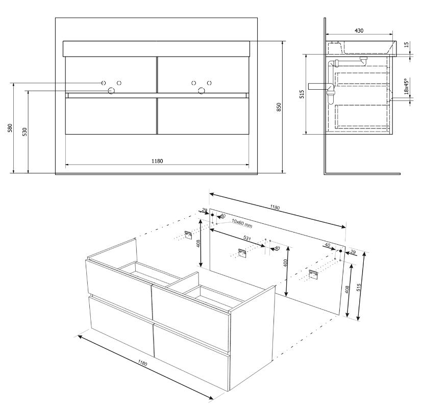 FILENA skrinka s dvojumývadlom 120 cm dubrozmery skrinky: 118x51,5x43 cm, rozmery umývadla: 119x11x44 cm