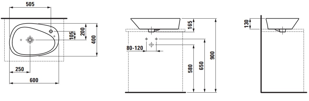 Laufen PALOMBA umývadlová misa s armatúrnou doskou 60 cm rozmery: 60 x 40 x 13 cm, s otvorom pre batériu
