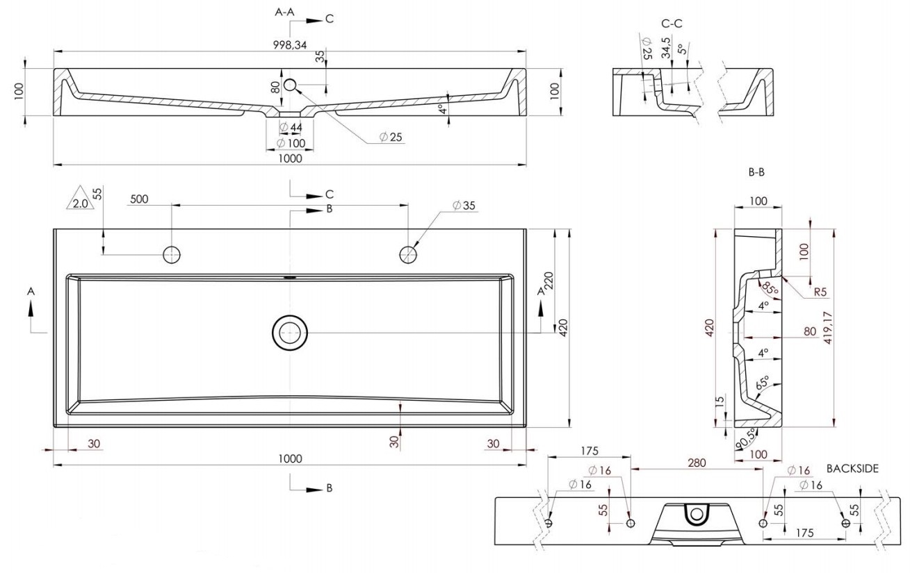 ORINOKO umývadlo z liateho mramoru 100 cm s dvomi otvormi rozmery: 100 x 10 x 42 cm, s prepadom, s 2 otvormi pre batériu, montáž: na stenu/na dosku