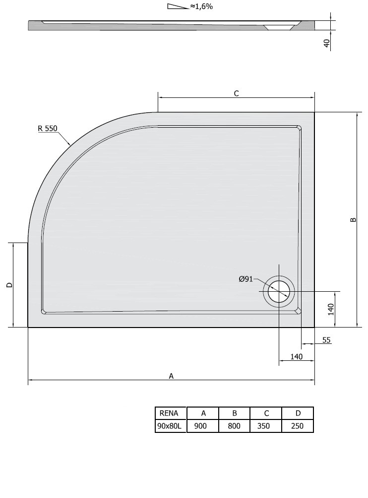 Polysan RENA štvrťkruhová sprchová vanička 90 x 80 cm asymetrická ľavá rozmery: 90x80x4 cm, rádius: R55, materiál: liaty mramor, prevedenie: ľavá