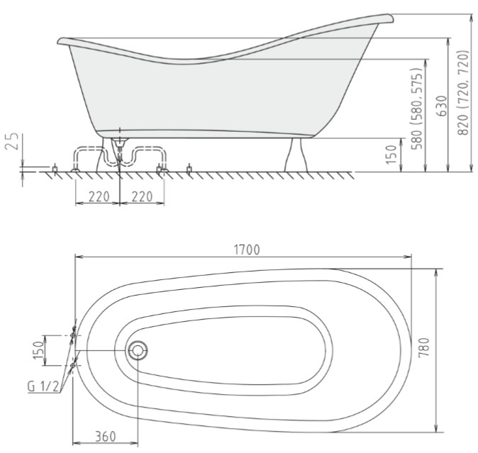 Popis Polysan RETRO voľne stojaca retro vaňa 170 cmPolysan rozmery: 170 x 78 x 72 cm, objem: 190 l, materiál: sklolaminát, nohy: biele/chróm/bronz