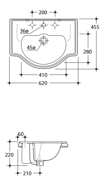 Popis RETRO zápustné umývadlo 62 cmSapho rozmery: 62x22x45,5 cm,s prepadom, s jedným otvorom pre batériu, druh montáže: polozápusté