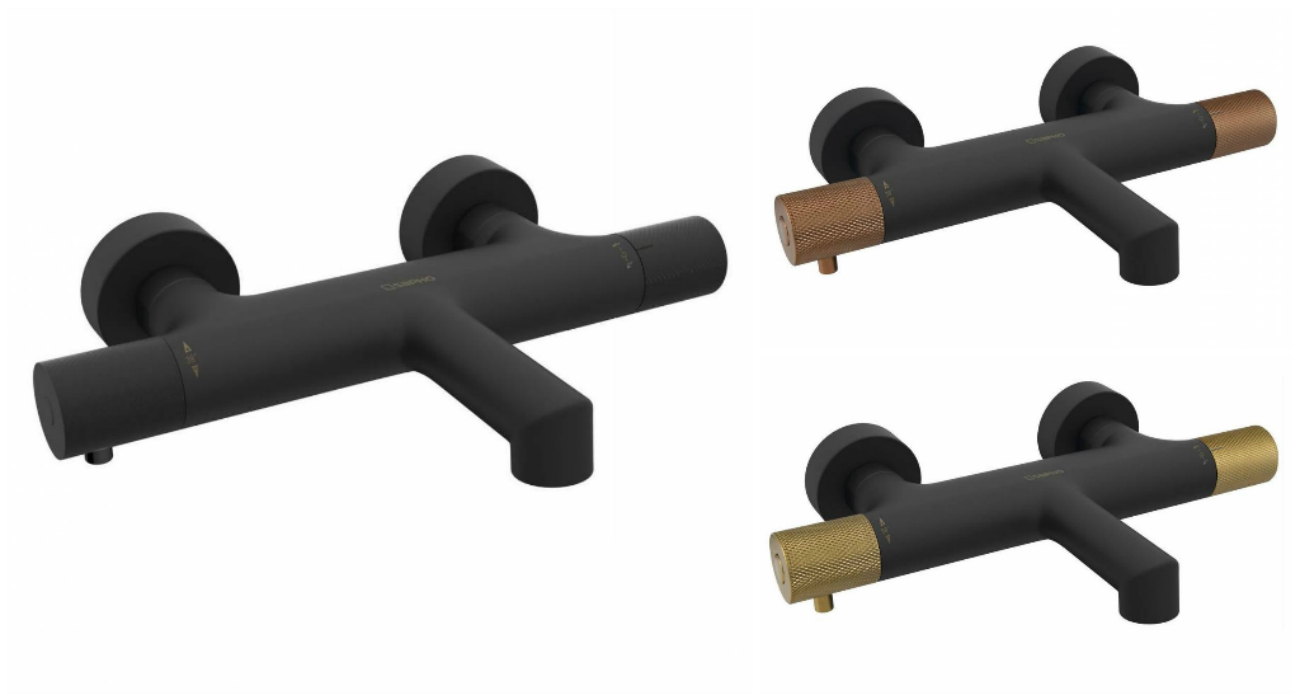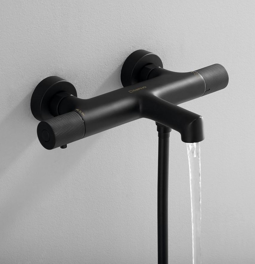 Popis SOLARIS čierno-zlatá termostatická vaňová batériaSapho termostatická nástenná batéria, DN 150 mm, čierna matná so zlatým, s prepínačom vaňa/sprcha